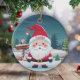 Santa, North Pole, St Nicholas, Kris Kringle, Father Xmas Ceramic Ornament with customizable name on his hat and featuring a North Pole white Christmas scene of winter wonderland snowy trees in the background. Unique cartoon whimsical character illustration graphic with wintry white snow landscape. The two-sided personalizable design always looks festive and complete, no matter how cute hanging decor gift turns. Order your custom decoration today and make your holiday season extra special! đŸŽ„đŸŽ…đŸŒ Diameter: 2.87". Thickness: 0.156". Weight: 1.4 oz. Made of white porcelain. Full-color, full-bleed printing. Included gold thread does not come attached/tied.