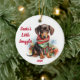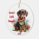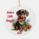 Celebrate the holidays with this charming round ornament featuring a watercolor dachshund all snuggled up in a cozy scarf. The text "Santa's Little Snuggler" above and the year "2024" below can be personalized to make this ornament uniquely yours! Perfect for dachshund lovers, this adorable ornament will add warmth and personality to your Christmas tree or make a thoughtful gift for friends and family. Bring some dachshund charm to your holiday decor with this festive keepsake!
