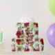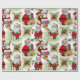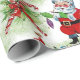 This vibrant, repeating pattern has a distinct mid-century illustration style set against a light, speckled green and white background. It features several vignettes of classic Santa Claus engaging in holiday preparations, such as sitting on a stool painting an ornament, standing with a large sack of gifts, and preparing to go down a chimney, often accompanied by a gentle reindeer. Interspersed between the Santa figures are detailed sprigs of holly or pine branches tied with red bows and featuring candy canes and small ornaments, creating a busy yet cheerful festive scene.