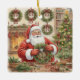 Bring the heartwarming magic of a cozy Christmas to your tree with this charming square ceramic ornament! Featuring a delightful illustration of Santa Claus happily crafting a festive evergreen wreath in his workshop, complete with a roaring fireplace, decorated tree, and plenty of crafting supplies.