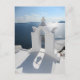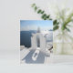 En vit kyrkklocka torn i Oia, Santorini kastar en skugga.