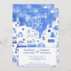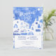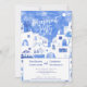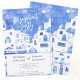 En modern vattenfärgsmålning av den picturesska staden Oia på den grekiska ön Santorini för att fira kärlek med lite elegans och skönhet. De här inbjudningarna är inspirerade av öns fantastiska perspektiv och har en vattenfärgsmålning av Oia i drömblå och vita nyanser. Originalkonst av Nic Squirrell.