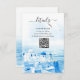 Blå Santorini Grekland akvarell destination bröllop detaljer bifogad kort med en QR-kod. Den visar en drömlik akvarellbild som fångar Santorinis unika charm. Istället för en strikt realistisk återgivning presenterar kortet en fantasifull, pittoresk vision av ön, med dess karakteristiska vitputsade byggnader som kaskaderar nerför klipporna och öppnar upp mot panoramiska havsutsikter. Kortet använder den vibrerande blå färgen på den egeiska himlen, med målade måsar för att föra dina gäster till Greklands magi. Använd detta kort för att informera dina gäster om de väsentliga detaljerna för det kommande evenemanget på ett sätt som är både informativt och vackert. Designen hämtar inspiration från Greklands romantiska