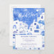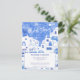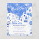 En modern färgsmålning av den picturesska staden Oia på den grekiska ön Santorini för att fira med lite elegans och skönhet. De här inbjudningarna är inspirerade av öns fantastiska perspektiv och har en vattenfärgsmålning av Oia i drömblå och vita nyanser. Ändra texten så att den stämmer överens med firande. Originalkonst av Nic Squirrell.