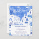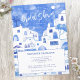 En modern färgsmålning av den picturesska staden Oia på den grekiska ön Santorini för att fira med lite elegans och skönhet. De här inbjudningarna är inspirerade av öns fantastiska perspektiv och har en vattenfärgsmålning av Oia i drömblå och vita nyanser. Ändra texten så att den stämmer överens med firande. Originalkonst av Nic Squirrell.