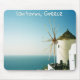 Watercolor-stil-bild av en kvarn kant vid kaldera i Oia på den grekiska ön Santorini