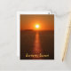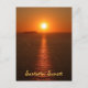 Santorini Sunset-vykort med textetikett. Fotografi från solnedgången på den grekiska ön Santorini (en av de mest fantastisk öarna i Grekland, och berömd för solnedgången). Djupt solnedgång i orangen med reflexion över havet och en syn tittar ut till havs mot kalderöarna.