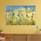 Levande blåcikoria och kornblommor blommar i en gyllene fält av gräs under en blek blå himmel. Även blondens och gröntens bakgrund avbryts av den mousserande rosan av gräblommor.