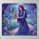 This fantasy poster features a Twilight garden: a purple-haired woman in a violet gown tends a potted plant on a stone path, surrounded by luminous butterflies and a quaint cottage.