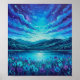 This vibrant poster features a dreamy, mystical blue landscape of turquoise hills, a tranquil mountain lake, and lush purple wildflowers under a swirling indigo starry sky, Impasto style art in a peaceful, vibrant midnight mystic palette. this poster comes in a custom size of 10.30" x 11.67"