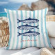 Tillsätt fiskarnas estetiska vibes till din hemdekoration med detta kusttemade dekorativ kudde som innehåller 3 hand plockade vintage stil sardiner på grund av akvblått och teal rand.