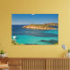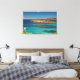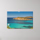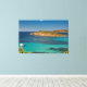 Ett vackert kanvastryck med ett originalfoto av det extremt genomskinliga kristallina vatten i det fria sardinska blåhavet i alla skalor av turkos, omgivet av grönt Medelhavsbusken med lite islet och några båtar i avstånd en solig sommardag.