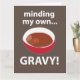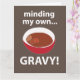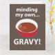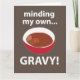 "Minding My Own Gravy" originaldesign av Nisha Prabhu. Vi presenterar vårt förtjusande "Minding My Own Gravy" matkort! Perfekt för matlovers och hemmakockar, fångar denna fantasifulla design essensen av husmanskost med en nypa humor. Oavsett om du serverar en smakrik stek, krämig mosad potatis eller en rejäl gryta, ger detta kort en rolig twist åt dina kulinariska skapelser. Perfekt för sammankomster, potlucks eller helt enkelt som en charmig tillägg till din köksdekor, är detta kort garanterat en konversationsstartare.