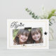 Vackert helgdag kort med fotohållare i ställe. Guld, svart och vitt färg med skriptteckensnitt med guld ram på en vit bakgrund med 3D-illusion av foto som testats på kortet. Rejoice. Julfoto-Helgdag-kort. Söt stjärnor konetti mönster på baksidan i guld och vitt. Elke Clarke © More helgdag fotocard and färg design available in my shop på www.zazzle.com/monogramgallery