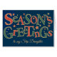 Ett julkort i snyggt för en stegdotter, med " Season's Greetings" i rött och vitt, mörk grönt och vitt polka-punktsbrev, skisserat i guld-effekt på en djup blå bakgrund och spridd med guld och röda stjärnor. Du kan enkelt ändra det inre meddelandet om den här textbaserade digitala designen av Judy Adamson, och om du inte kan hitta ett kort för den person du vill skicka det till finns det en anpassningsbar-front-version som du kan anpassa.
