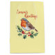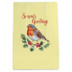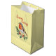 Säsongens hälsningar från Cheerful Robin Medium Gift Bag. En glad julrån sitter fredligt på ett rött bär gren, lugn och seren mitt i vinterkylan, dess försiktiga närvaro som ger värme, glädje och ett tyst föreläggande om jul.