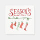Festive hand skrev "Season's Greetings"-text med modern illustration av en mängd olika julstrumpor som hängde från träd gren