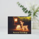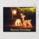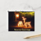 Säsonhälsningar God jul Hjort Post card med tänd Hjort jul-Ljus och en glödande julklapp på ytterdörren. Julpostkort för företag eller vänner som firar jul.
