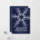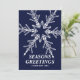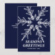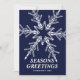 Modern och djärv julkort med stor snöflinga, "säsonhälsningar" i vit text och marin blå bakgrund. Anpassa den med din egen text framtill och bakåt.