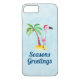 Telefonväska med texten: Säsonhälsningar. En viskig teckning av en rosa flamingo som bar en röd tomhatt. Stå på ett berg av strand med gult med grönt och brunt kokosnöt handflatan träd i ryggen. Ljusblå bakgrund med svag polygonal mönster. Tur- och roligt-tropiska former.