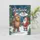 Share some holiday humor with this funny Christmas card that captures a magical moment - when Santa and Sasquatch unexpectedly cross paths in a snowy forest. With wide-eyed surprise and playful thought bubble that say "you DO exist!", this whimsical artwork captures the joy of believing in the unbelievable. Perfect for fans of Bigfoot, Santa and those who don't stop believin'. Also available as a folded card