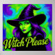 Den här poster är en levande, snyggt illustration av en häxa med träffande grönt och djupa lilor, med en klassisk, spetsig svart häxhatt. Bakgrunden har blåa och grönt som snurrar runt och skapar en dynamisk, nästan magisk atmosfär. Häxens uttryck är tillitsfullt och något lekfullt, kompletterat med fet makeup, inklusive ögonbryn och läppstift av mörk. Uttrycket "Witch, snälla" står skrivet i ett stort, kursivt brev gult-grönt vid grund och lägger till en humoristisk, modern vändning till det traditionella temat häxa. Denna lekfulla formulering fungerar ofta som en pun eller kinkig retort i populär kultur, som blandar magiska bilder med avslappnad, sassi språk. Symboliskt sett har konsten en gemensam häxestetik - grönt, spetshud - som ofta förknippas med Halloween och fantasi Lore. Det skarpa, kontrasterande färg och det moderna typsnittet stil betonar en roligt som ger makt åt häxarketypen i stället för en skrämmande eller ondskefull sådan. Avslutat som ett färgtryck av oljefärg.