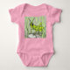 Illustration body en jersey rose. Sauterelle verte style cartoon dans les herbes.