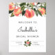 Denna välkomstskylt till bröllopsduschen har akvarell-persikor, vita blommor och en fantasifull typsnitt. All text är redigerbar för att passa alla evenemang - baby shower, bröllopsdusch, möhippa etc.