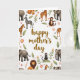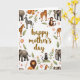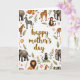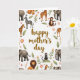 Det här kortet har orden ”Happy Mother's Day” centrerade i en flytande, bränd guldfärg som sticker ut tydligt mot en vit bakgrund. Runt meddelandet formar en ring av savanndjur en mysig ram med varsamma elefanter, lugna lejon och långa fläckiga giraffer som lutar sig inåt som om de delar en tyst stund tillsammans ❤️. Randiga zebror och små apor ger rörelse åt scenen, vissa sitter på löviga grenar som om de håller vakt över hälsningen. Mellan djuren skapar mjuka rosa blommor med soliga gula mittpunkter och små kvistar med ljusorange blommor en trädgårdsliknande kant som känns omsorgsfull och närvarande. Grönt varierar från färska bladnyanser till djupare toner som hjälper de varma djurfärgerna att kännas jordnära och naturliga. Huvudtexten är kvar i mitten medan illustrationerna hålls mest längs kanterna