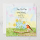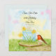 This spring-themed 60th birthday save the date features a daffodil-inspired cake, the flower of March, with a robin perched on a wooden cake stand—symbolizing joy, renewal, and a beautiful new chapter.