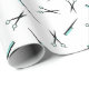 Vit som slår in papper med ett mönster av hårkammar och sax i svart och turkos.