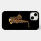 Utformning med bild av gyllene metallsaxofon på svart bakgrund; elegant, enkel jazz musikinstrumentdesign