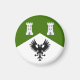 "Per chevron vert och argent, två torn-argument och en dubbla örn visade sable."