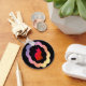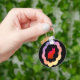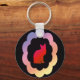 Den här designen har gjorts med Photoshop. Bakgrunden är ett svart ram med ett snitt som visar ett regn av färg. En svart cirkel med ett skalat kant visar en katt designad med en röd nyans. Denna nyckelring är stark men är en grundläggande nyckelring. Byt färg i bakgrunden om du vill eller lämnar färg där det är.