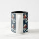 This striking coffee mug features a bold, seamless repeating pattern inspired by traditional Scandinavian folk art. The illustration depicts cozy red cottages and stylized evergreen trees against a dark, snowy background. The high-contrast design creates a warm and nostalgic winter atmosphere, perfect for curling up by the fire. This unique mug is a lovely holiday gift for those who cherish Nordic design, graphic patterns, or distinctive home décor during the winter season.