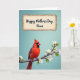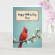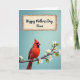 Det här kortet visar en slående röd sångfågel med en hög tofs som sitter på en blommande gren i det nedre vänstra hörnet, som om den tar en paus för att dela en tyst minut ❤️. Fågelns scharlakansröda fjädrar övergår i djupare röda nyanser längs vingarna och stjärten, och en mörk ansiktsmarkering drar uppmärksamheten till dess vaksamma öga, vilket ger scenen en mild, uppmärksam stämning. Bakgrunden har en lugn akvaton som känns som vårens friska luft, vilket håller fokus på fågeln och blommorna. Vita blommor med små gyllene centra pryder grenen, med mjuka gröna blad inklämda runt dem, vilket ger en frisk och tillgiven touch 🌼. Nära toppen sitter en horisontell rektangel i en varm pergamentfärg, kantad med en grov brun kant som ser lätt sliten ut. Greetingtexten är centrerad inuti den rektangeln i mörkt bläck
