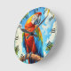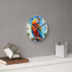 A vibrant scarlet macaw with blue and green wing feathers perches on a branch against a backdrop of a bright blue sky with fluffy white clouds. The bird's head is turned slightly to the side, showcasing its sharp black beak and intelligent eyes. Lush green foliage surrounds the branch, creating a tropical jungle setting.