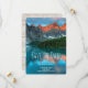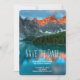 Bröllop spara datum-kort med ett vackert foto med ett vackert bergsområde, grått och rost färg. En skog med grönt omger en lugn sjö. Grymt outdoorsisk bild.