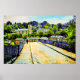 Färgfull vattenfärgsbild av Ironbridge, Väster Midlands, som visar historisk arkitektur omgiven av lush grey, med ett lugnande omslag för himmel. Perfekt av engelsk historisk skönhet som fångats i vattenfärgen stil.