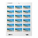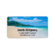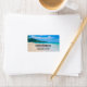 Adressetiketter med ett foto av en fantastisk semesterplats. Blått blå himmel, mjuk sandstrand med tropiskt kristallklart blått vatten. Ett lush träd täckte berget i bakgrunden. Scenfotografi och lugnande fotografi.
