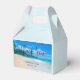 En liten korg med ett foto av en fantastisk semesterplats. Blått blå himmel, mjuk sandstrand med tropiskt kristallklart blått vatten. Ett lush träd täckte berget i bakgrunden. Scenfotografi och lugnande fotografi.