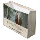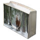 En stor presentsäck med ett foto av en brun häst med en lång vit skorpa. Stå i en skog där snöflingor faller runt.