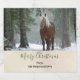 Flaska-etiketter med ett foto av en brun häst med lång vit skorpa. Stå i en skog där snöflingor faller runt.
