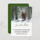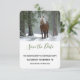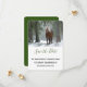 Spara datumkortet för en jul Party med ett foto av en brun häst med en lång vit skorpa. Stå i en forst med snöflingor som faller runt.