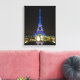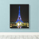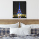 En scenvy från Paris, Frankrike. Berömdens landmärke, eiffel torn, som ses på natten upplyst av ljusblått ljus.