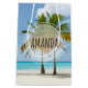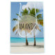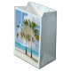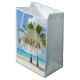 Giftväska med ett vackert och stillastående foto på 2 handflatan träd under ett ljust blå himmel. Stå på en utspridd tropisk strand med lugn turkos vatten.