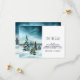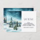 Jul spara datumkortet med en vattenfärgsmålning. Gräs träd täckte med snö i en vinterscen. Snöflingor som faller ner på en mark täckt av snö. Vita och blå fluffa moln i himlar. Med ett fruset sjö i bakgrunden. Fredlig moody vibe.