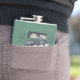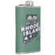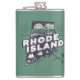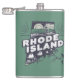Hip flask features a retro style scenic Rhode Island vignette in a state shaped silhouette.