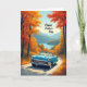 This design shows a classic turquoise convertible 🚗 gliding along a curving asphalt road through an autumn forest, its chrome details catching the light like a polished keepsake. Tall trees crowd in on both sides, their leaves shifting through amber, gold, and deep orange, creating a cozy tunnel that feels made for a shared drive and quiet conversation. In the distance, rolling hills fade into a soft blue haze and cradle a calm lake that reflects the clear sky. Sunlight streams across the scene, laying gentle shadows over the road and adding depth to the layered foliage. Near the top of the card, a short Father’s Day message appears in a flowing white style, arcing slightly across the sky so it stands out without overpowering the artwork. The open-top car suggests someone special in the passenger seat 👨, with the road ahead hinting at easy companionship and steady care. The windshield glints, the tires trace the bend, and scattered leaves line the roadside beneath the glowing canopy.
