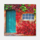 Ett vackert naturfoto med en gammal trädörr målad turkos-grönt med en röd brickvägg och ett tittar fönster. Muren och dörrarna är omgivna av djärvt och levande rött och grönt höst löv under förändringen av säsonger. Söt färg och belysning.